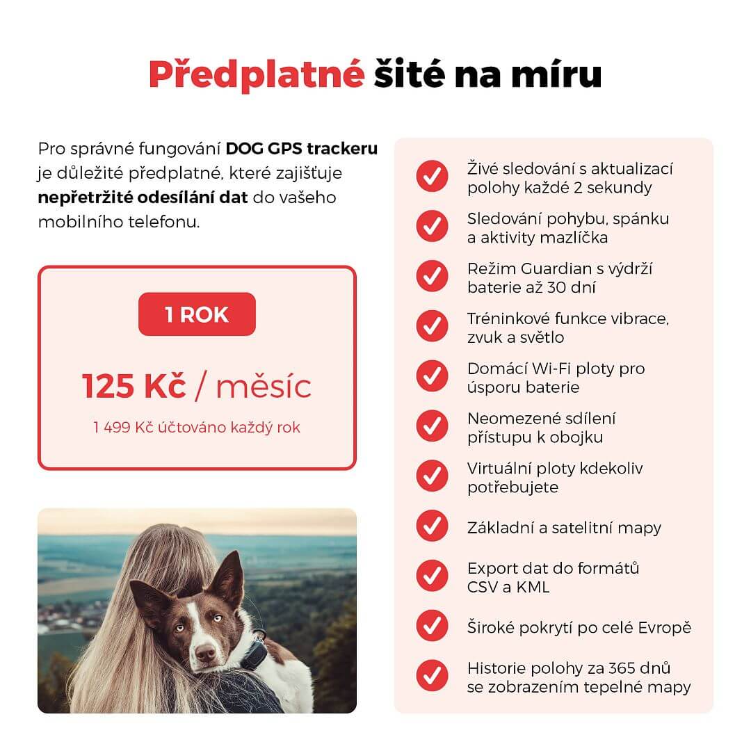 Předplatné umožňuje neomezené sdílení přístupu celé rodině i přátelům. Režimy, které se přizpůsobí tempu vašeho mazlíčka s živým sledováním, které aktualizuje polohu každé 2 sekundy. Zobrazování základních a satelitních map s prohlížením historie polohy až 365 dní zpětně včetně exportování dat do formátů CSV a KML.