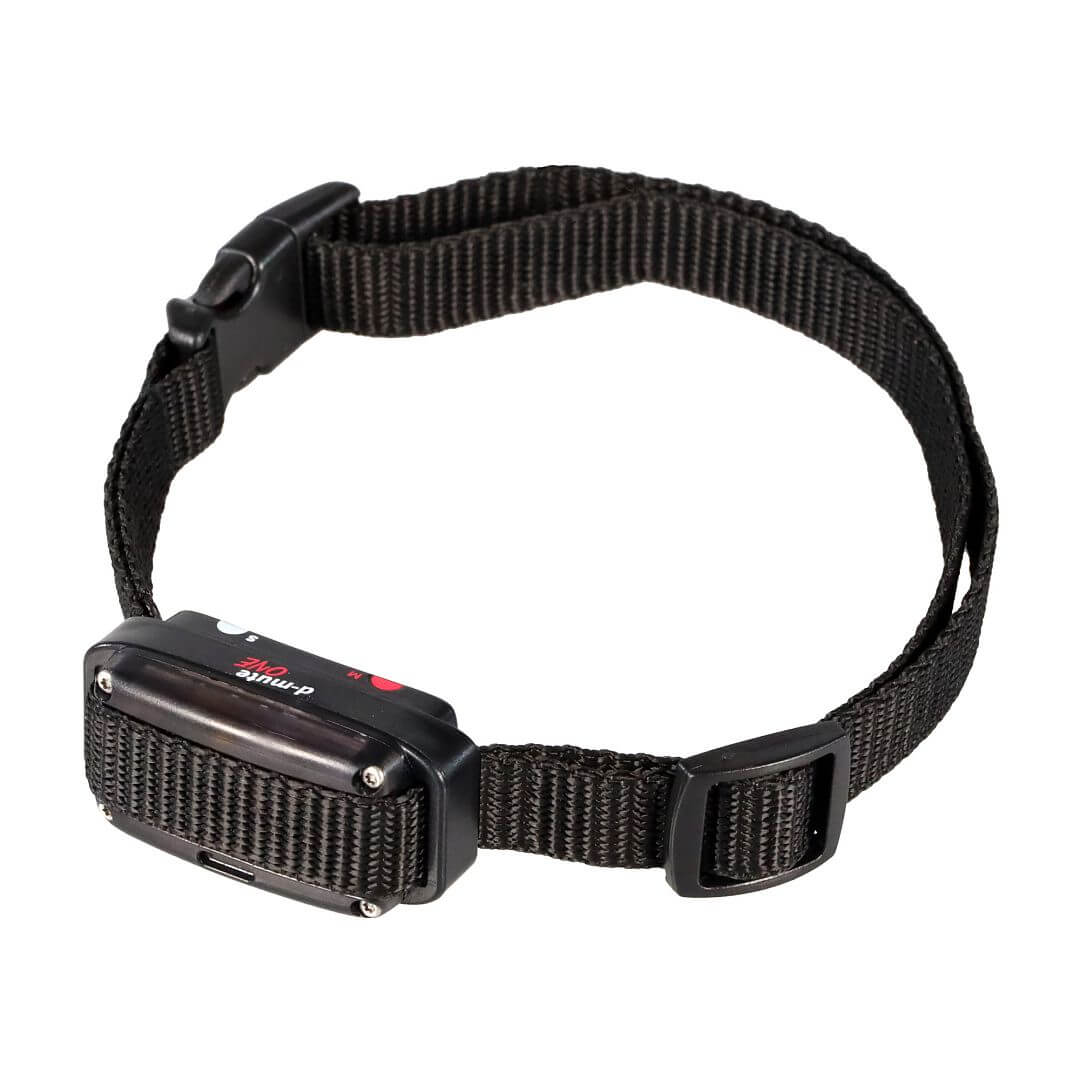 The d-mute device, consisting of a receiver and collar, facilitates teaching the dog to remain quiet. The collar must be placed onto the dog’s vocal cords to accurately assess the barking; it must be sufficiently tightened so that it cannot change its position, but must not strangulate the dog. It activates automatically when the dog is barking, or when howling or growling. Operating mode, i.e. the sensitivity, the correction method and the response time, can be simply set. Correction means an acoustic signal or a stimulation impulse, or a combination of the two.