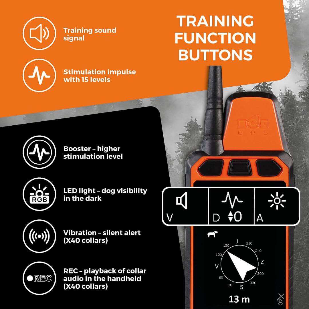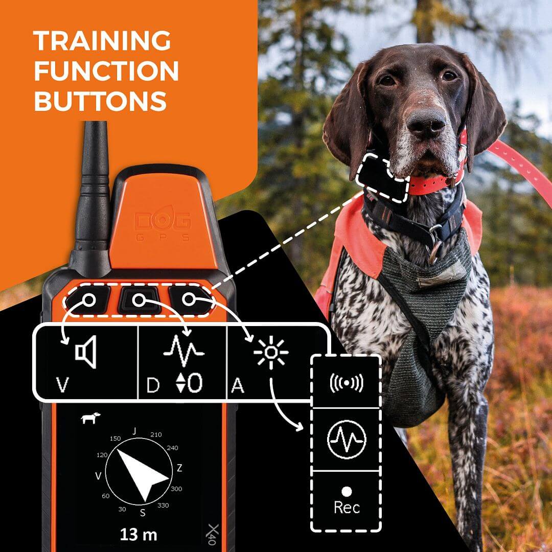 Hunt smarter with the DOG GPS X40 tracking and training system designed for the demanding needs of hunters and their dogs. The compact, 100% waterproof device with a 3,2 inch display with high-contrast and long battery life of 50 hours can handle the toughest conditions.