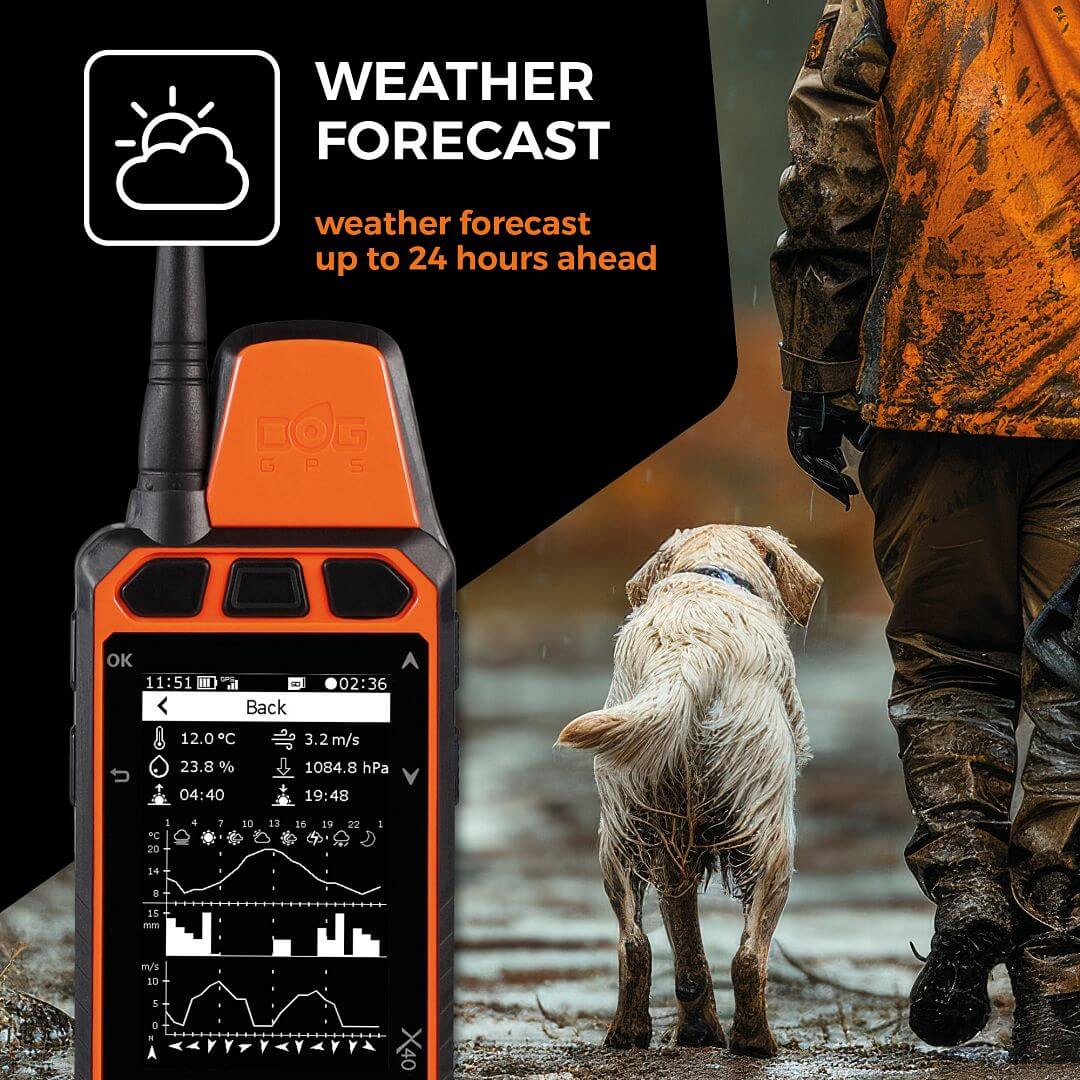 The weather forecast function provides detailed information on weather conditions with current wind direction and speed, precipitation and approaching storms - so you're always one step ahead. The device is also equipped with smart features such as a stopwatch, tracking with map display and an audio recording so you can hear what's happening around your dog's collar.