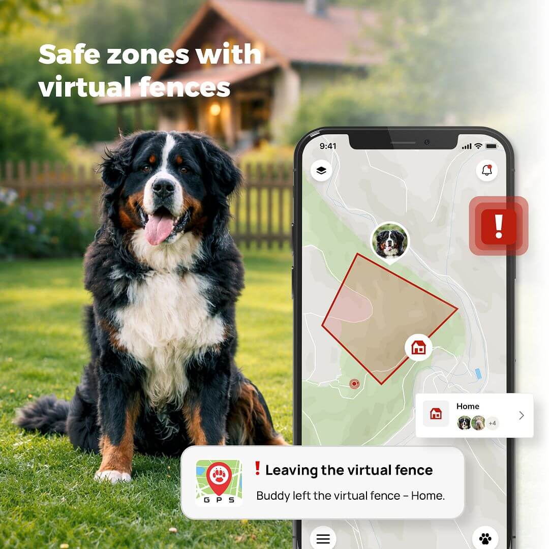 The Pet Tracker app pushes the boundaries of safety with virtual fences and solves every dog parent's nightmare, namely running away from the garden. With a virtual fence, you simply set a boundary around your house or cottage or on a camping holiday to create a safe space. And if your dog should happen to cross it, you'll be alerted immediately and can take action in time.