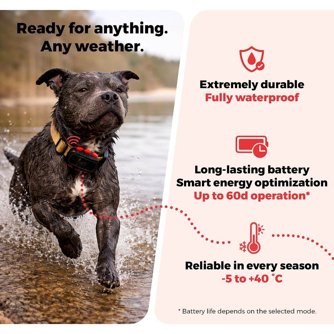 Going for a walk with your furry friend? Do you love hiking together in the mountains? Do you run canicross? Or just going on holiday to relax? The tracker DOG GPS ultra is ready for everything. A modern design and practical ergonomic shape with a weight of 70 grams for small and large dogs. It can withstand a lot of heat, water, mud, snow and frost. Plus, it's shatterproof thanks to the highly durable material.