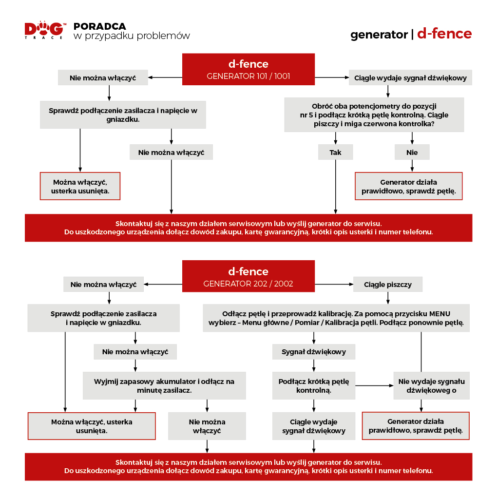 Jeśli masz problem z naszym generatorem niewidzialnego ogrodzenia dla psów, nie rozpaczaj. Zanim wyślesz go do reklamacji, spróbuj skorzystać z naszego przewodnika rozwiązywania problemów. Wykonaj kroki krok po kroku, jeśli nadal nie możesz naprawić usterki, skontaktuj się z naszym działem reklamacji. Doradca w przypadku problemów z generatorem d-fence Dogtrace