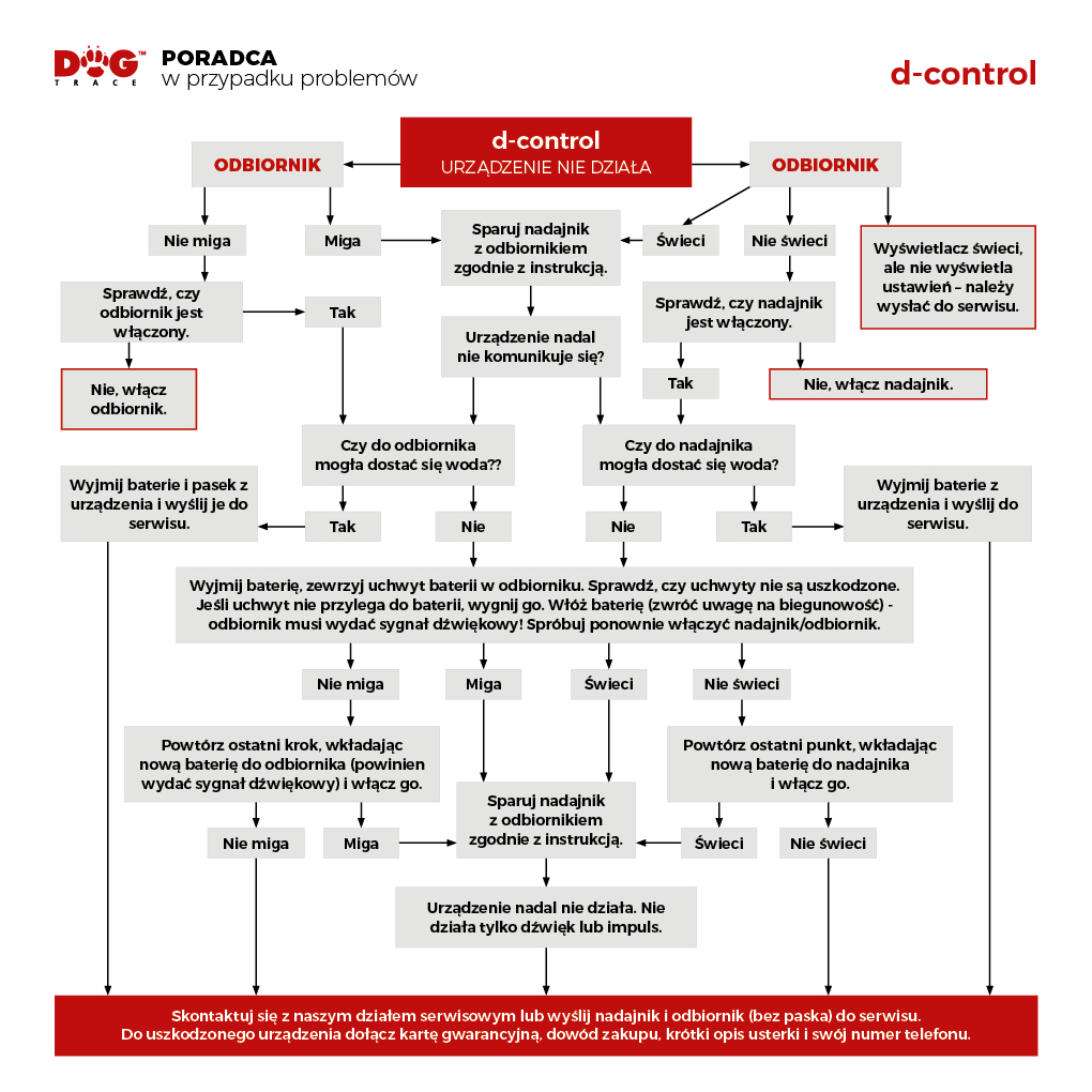 Czy sygnał dźwiękowy i impuls korekcyjny obroży treningowej d-control nie działają? Sparuj je! To proste, wystarczy postępować zgodnie z krokami naszego doradcy ds. rozwiązywania problemów. Jeśli nadal nie możesz naprawić usterki, skontaktuj się z naszym działem reklamacji .