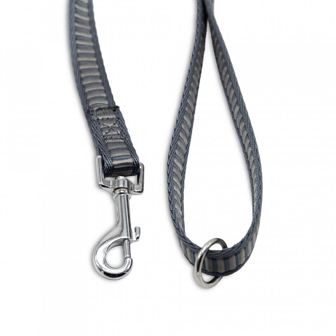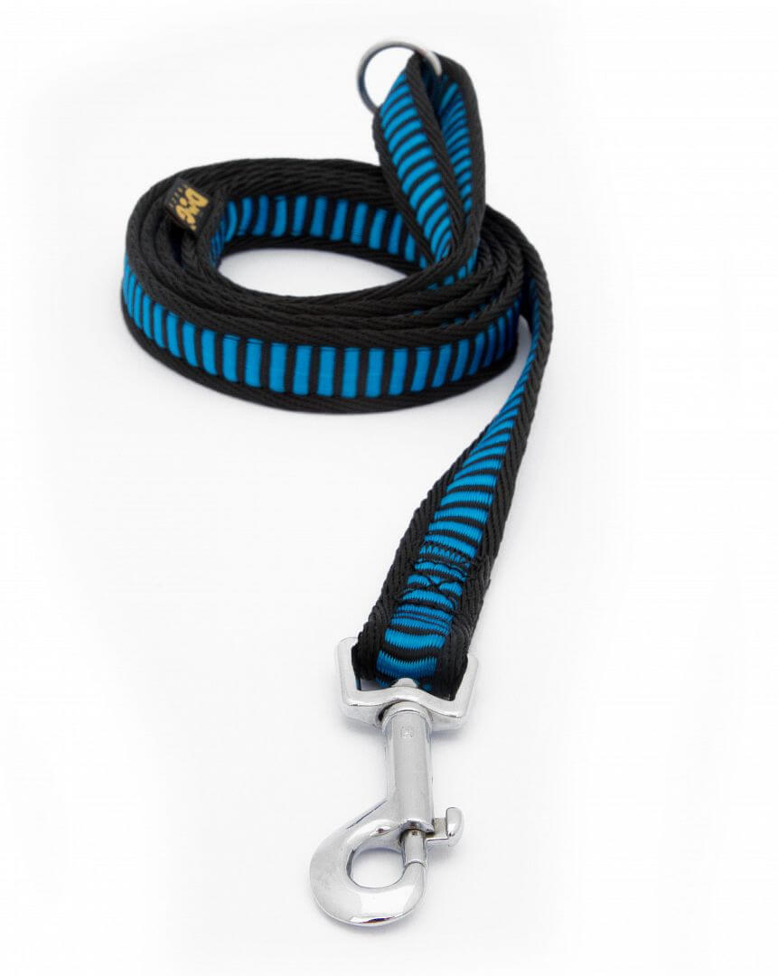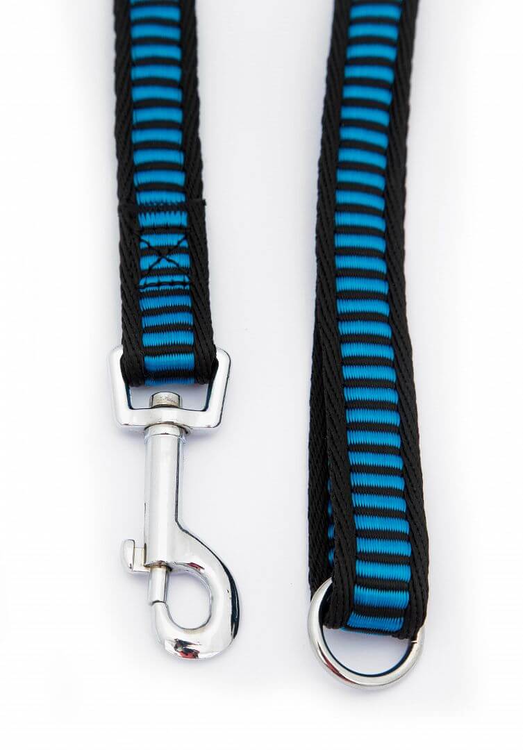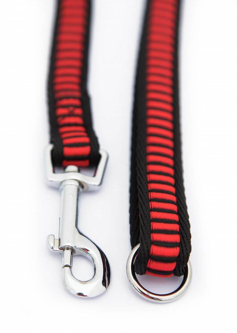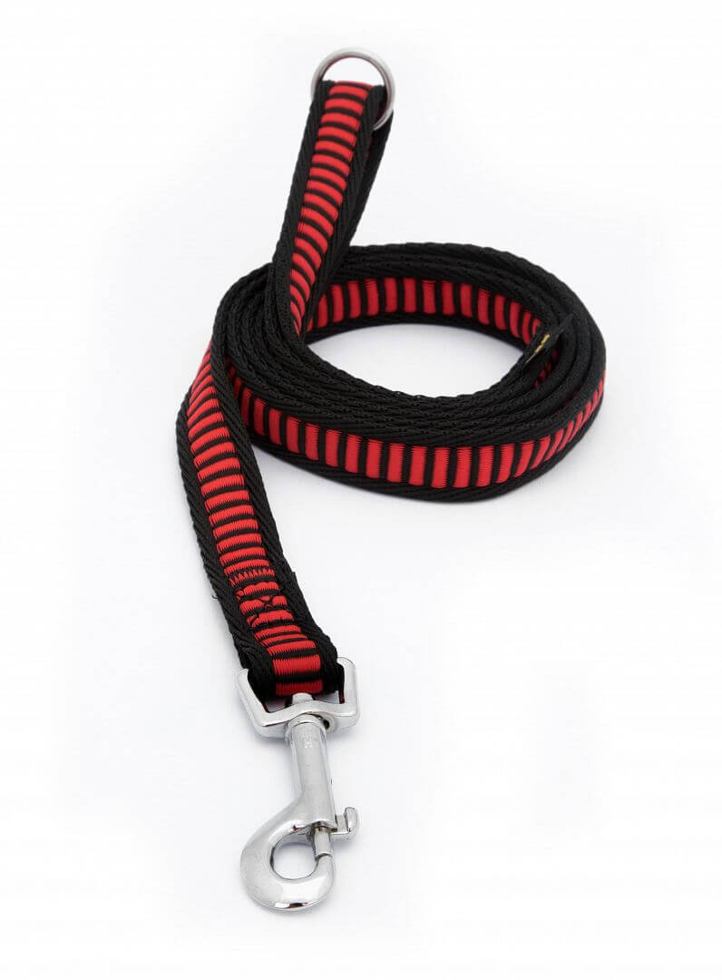 Smycz wykonana z przyjemnej i miękkiej taśmy z drabinkowym wzorem. Smycz jest dobrze zszyta, dzięki kilku pierścieniom można ją skrócić lub wydłużyć.