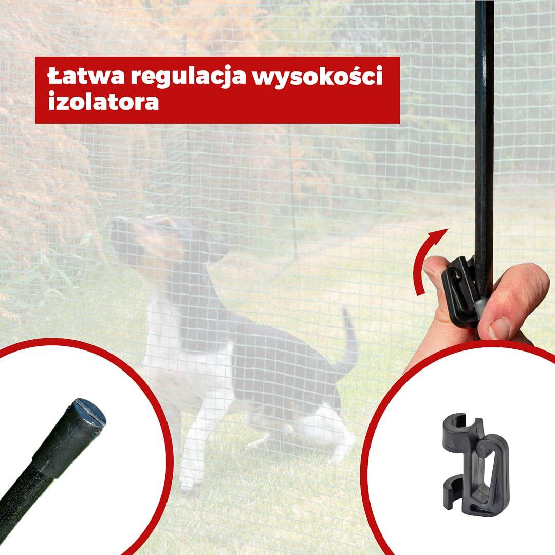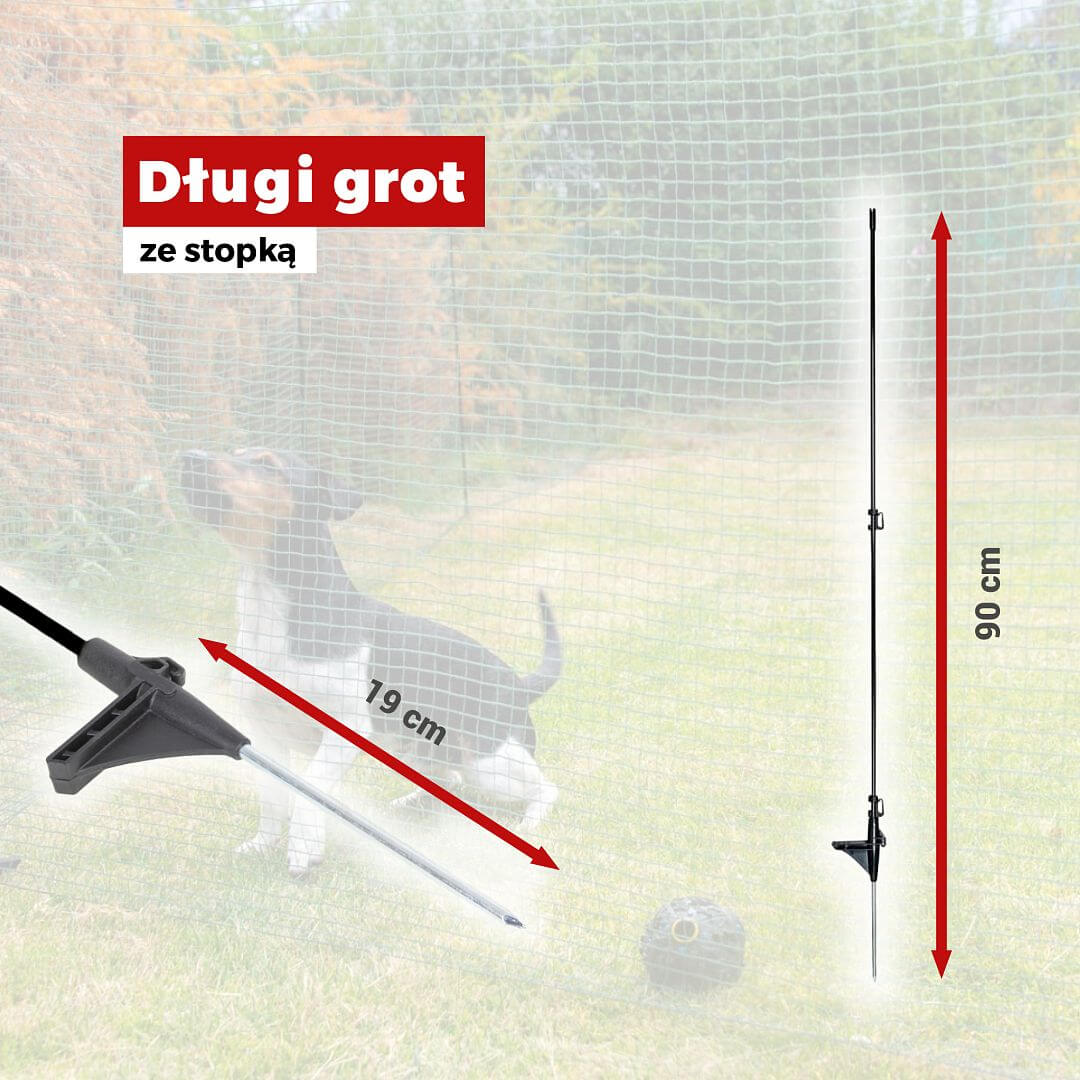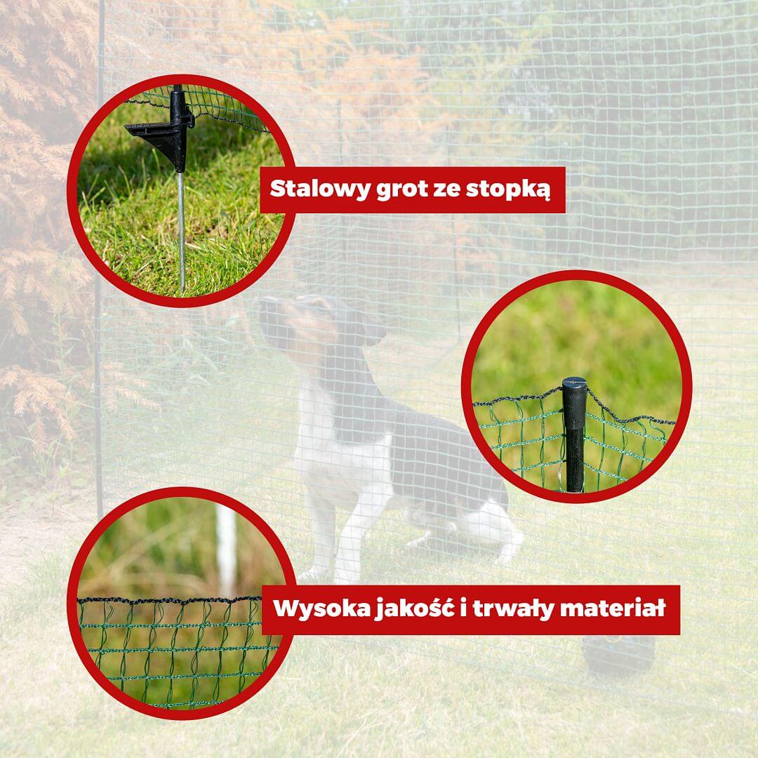 Kompletny zestaw do niskiego mobilnego bezprzewodowego ogrodzenia dla psa. Zapobiega niszczeniu upraw przez psy. Nadaje się do ogrodzeń w ogrodzie lub na kempingach. Uniwersalna siatka to sposób na ogrodzenie obszaru, aby zapobiec ucieczce zwierząt domowych. Idealna do ochrony rabat kwiatowych lub zabezpieczania oczek wodnych.