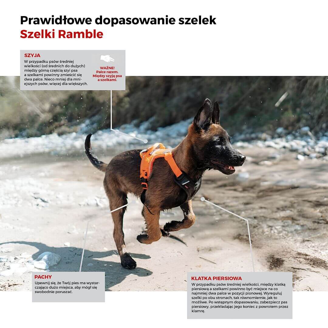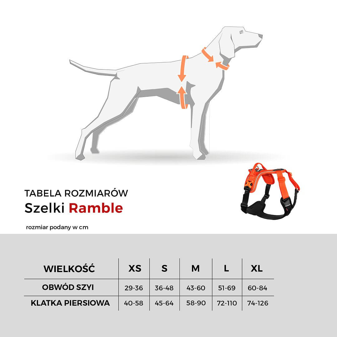 Rozmiary nakładają się na siebie, dzięki czemu szczenięta mogą z nich korzystać przez długi czas. Wybierz swój rozmiar zgodnie z tabelą rozmiarów uprzęży Ramble.