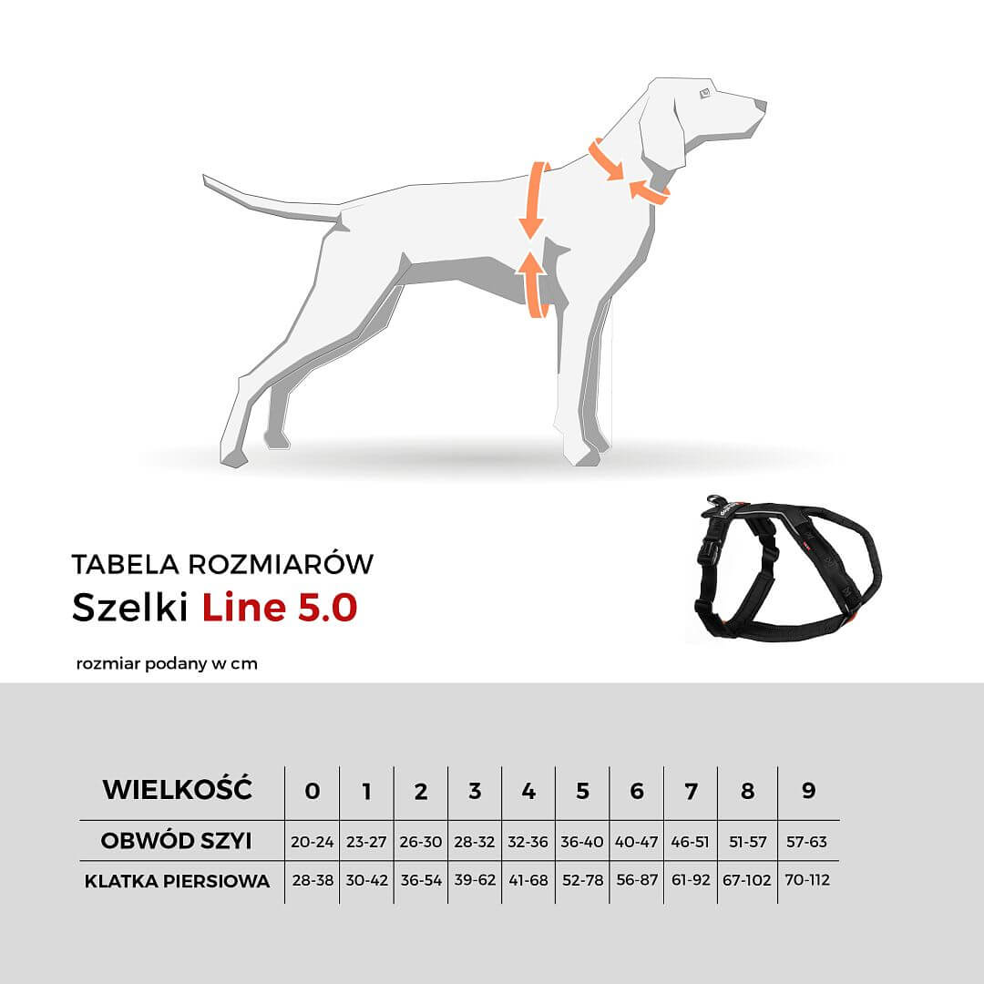 Ostrożnie wybierz rozmiar uprzęży Line 5.0 dla swojego psa zgodnie z tabelą rozmiarów.
