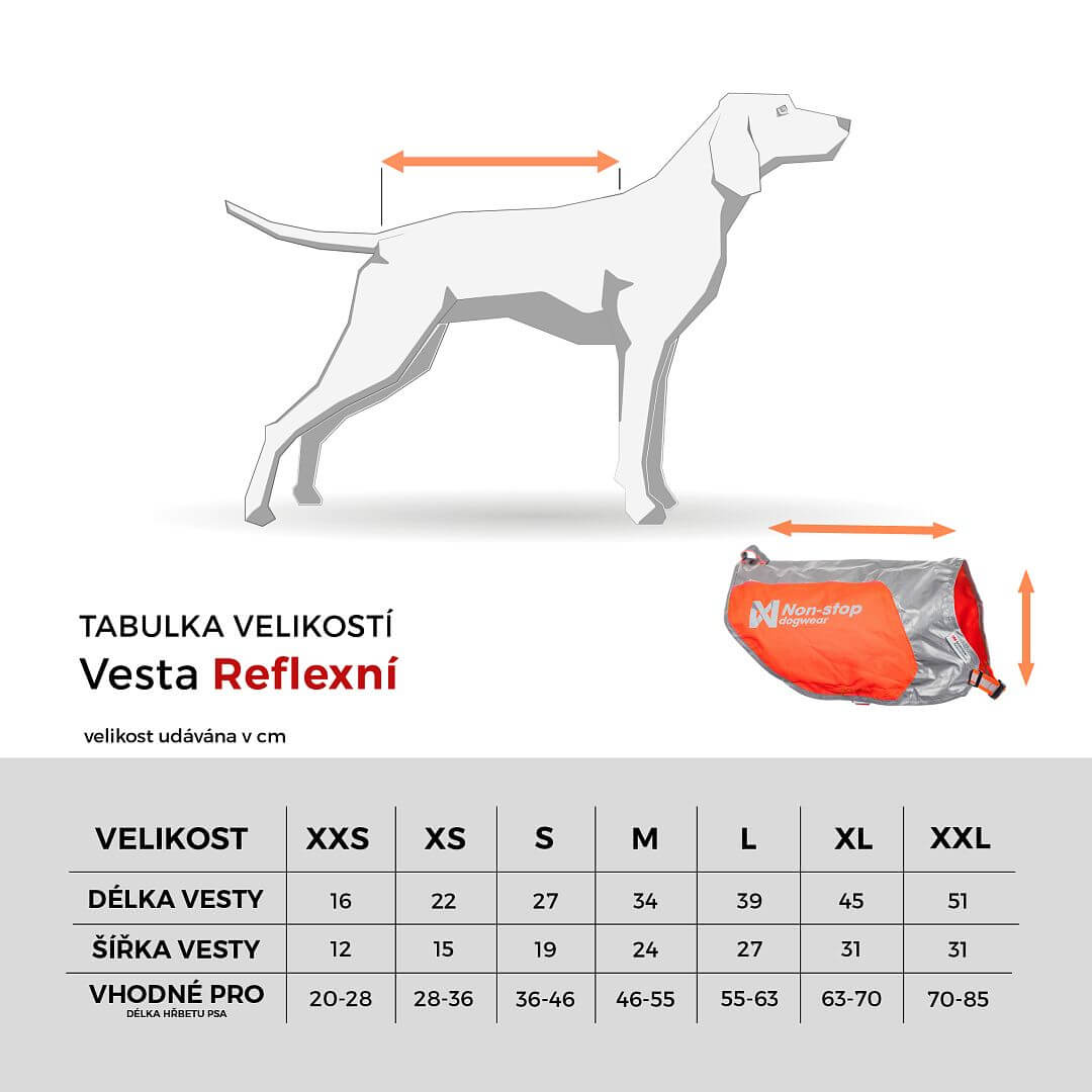 Vhodnú veľkosť vyberte podľa veľkostnej tabuľky. Reflexná vesta je ušitá tak, aby ideálne pokrývala 2/3 chrbta psíka.